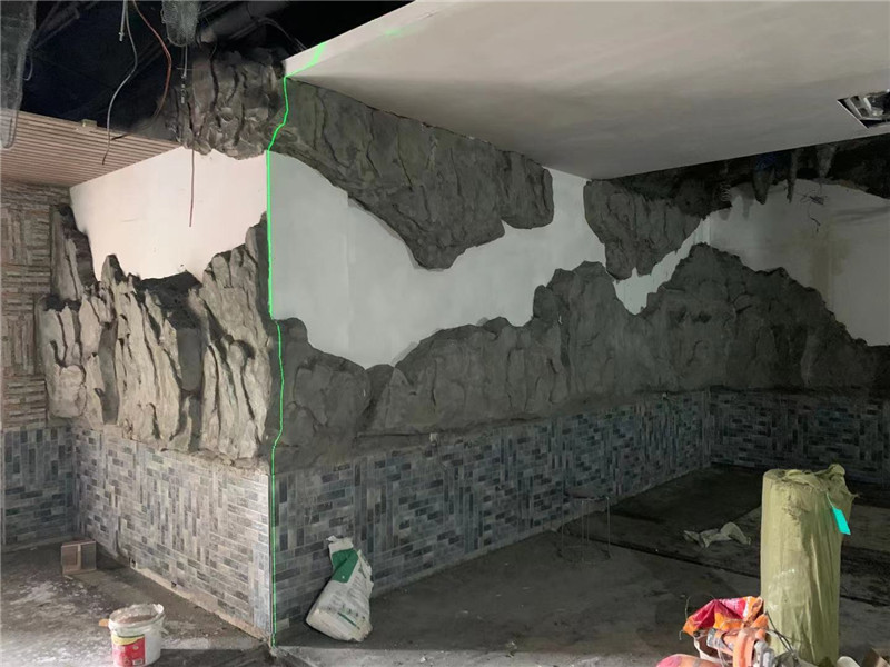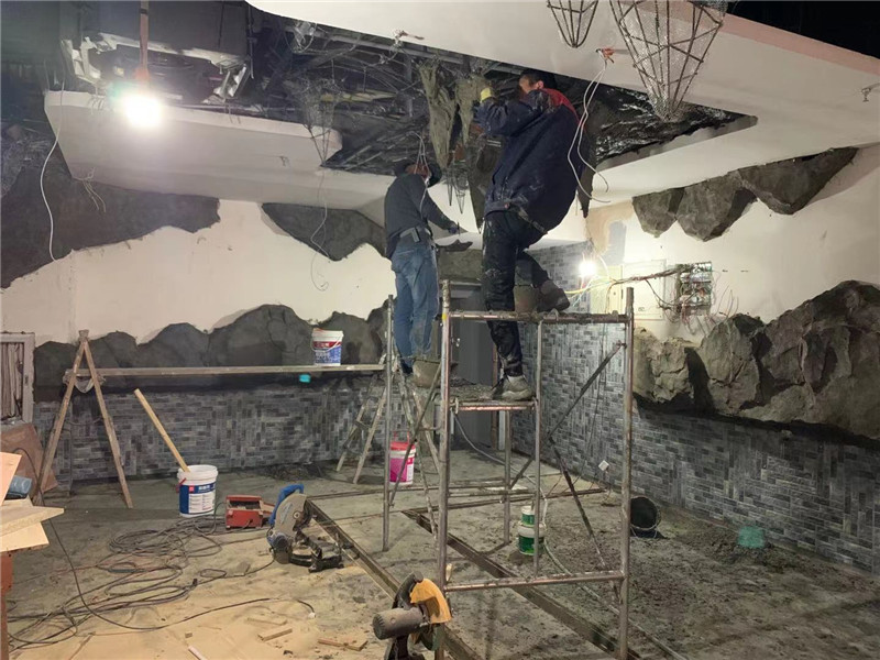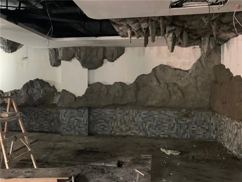 本單位承接上海滴水湖馨苑室內水泥直塑,場所是一家燒烤酒吧,設計師的設計靈感來自于山海經內部場景,山海經內部大量運用了山水,餐廳整個墻壁及頂部都運用了山體造型包裹,把水泥直塑運用在整個裝修,體現出人在山洞中體現古代人文生活,在這種環境喝著酒唱著歌一天的心情放松很多。水泥直塑采用了水泥直塑內部鋼骨架結構,經過專業的師傅雕刻最終呈現出山體感覺。總體工程量在300平方米左右運用工期20天。水泥直塑假山在現代裝修中大量被設計師運用。將成為一個時代的主流。期待后期的效果